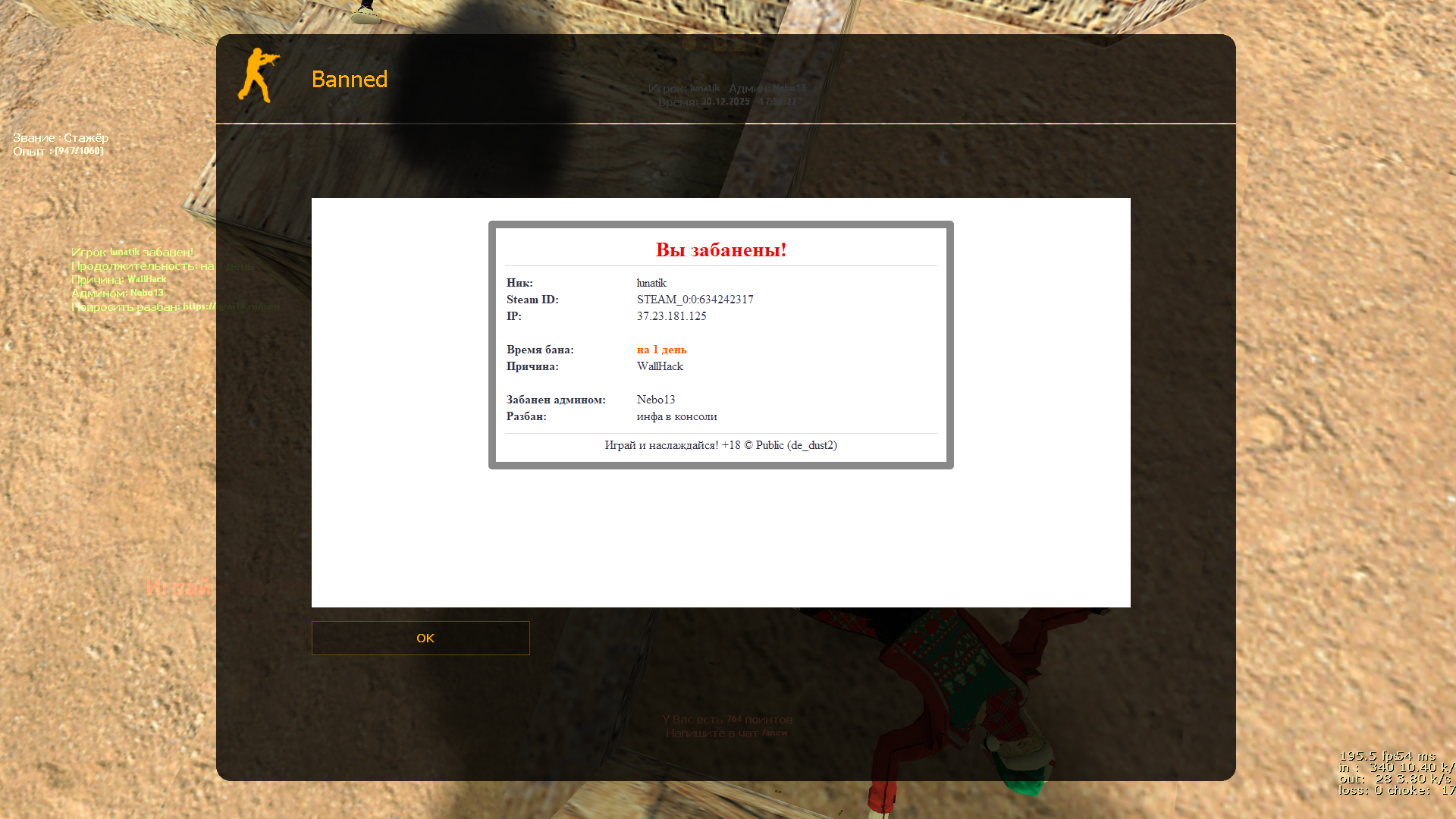 Забанила меня за ВХ, но изначально она попросила демо. Я бы конечно его скинул, просто в момент игры мне было не удобно этого делать, я это и сказал. Я её попросил провести полную аналитику демо на демочекер+замедленный режим, только тогда я готов был скинуть. Ответа на это я не получил, хорошо. Вот моё демо. Девушка, вы поймите что на ВХ проверяют во время игры а не на демо) + ко всему у вас админ тресера, на них легко определить есть ли у меня вх или нет(это делается в режиме онлайн) Вот на АИМ демо проверяют лично, его скачивают и делают аналитику в замедленном режиме на поведение прицела. Спасибо, но за бан я осуждаю, могли бы просто согласиться с тем, что вы готовы провести полную аналитику моего демо и я бы вам его отправил, а на вх вы бы и в реальном времени в спеках смотрели)